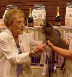 - Dushenka Belucia who won Best of Breed Russian Blue kitten, 1st in all her classes, Best of Variety Foreign Kitten, and was then whisked away to the front of the show hall as Best in Show Foreign Exhibit... The Best in Show panel was John Hansson, Helen Marriott-Power and Jane Allen, and the competition was fierce. As a first step the judges were asked to vote for their top three cats and the show manager announced that the shortlisted cats were the Persian, the British, the Burmese - and the Foreign too, as there was a tie. Then the judges looked at the shortlisted cats again - I was so proud of Lucy who just calmly lay stretched out in her steward's hands, and just so pleased with her for getting that far. But you've guessed it, that wasn't enough for my girl, who was announced as the Overall Best in Show Exhibit!