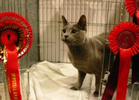 - Grand Champion Dushenka Czar Koreshki, won his third Grand certificate and title - well done big Korei, and your proud owners Donna and Dave Johnson of Koreshka Russian Blues! He also won Best of Breed and a further two 1st prizes against some strong competition. (Thanks to Donna and Dave for three of the photos below too).