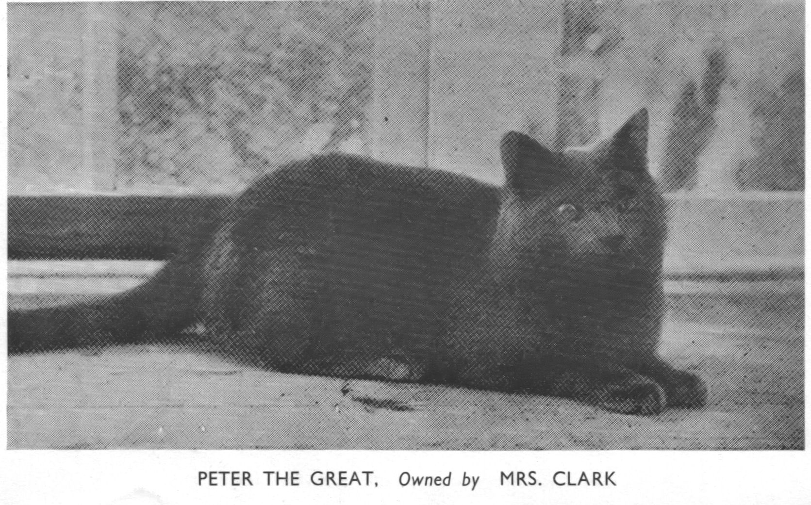 What we do know for sure is that Russian Blues in the UK can trace their pedigrees back 30-odd generations to the 1890s and cats imported from Russia by Mrs Constance Carew-Cox, a renowned cat fancier, famous for her Abyssinians, British and Manx cats, as well as her Russian Blues. Some of Mrs Carew-Cox's imported cats who are behind today's Russian Blues include her 'peculiarly lethargic' female, Lingpopo, Olga and Fashoda, via her stud cats, their well-known descendents Bayard and Muchacho, Bayard's son Ivanovitch (born 1904) and Muchacho's son Peter the Great (born 1902).